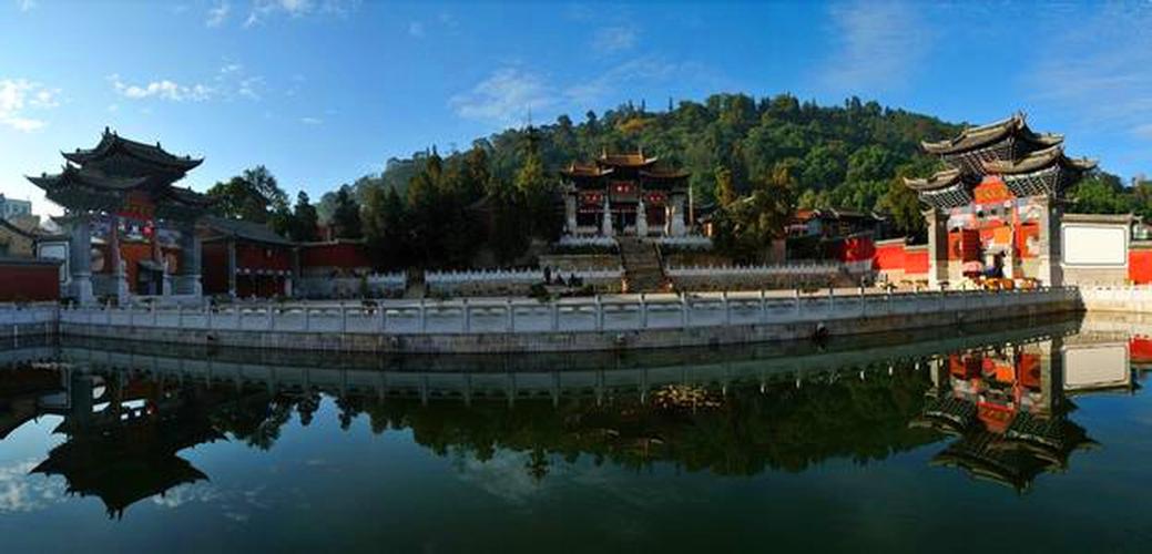 始建于元末,歷經(jīng)明清歷代重建重修,現(xiàn)為清初和清末的建筑。寺中保存下一堂(六扇)木雕槅門,出自清末滇南木雕藝術(shù)家高應(yīng)美之手,槅子門中的構(gòu)圖、布局、人物造型,被省內(nèi)外學(xué)者稱之為“海內(nèi)第一木雕”。三圣宮布局為三進(jìn)式兩院,由大殿、后東西兩廂、中殿、前東西兩廂、前殿(重檐)及前、中、后的六個(gè)躲間組成,外設(shè)圍墻并呈船形,墻外雙溪環(huán)繞而過(guò)。1993年被省政府公布為“第四批文物保護(hù)單位”。