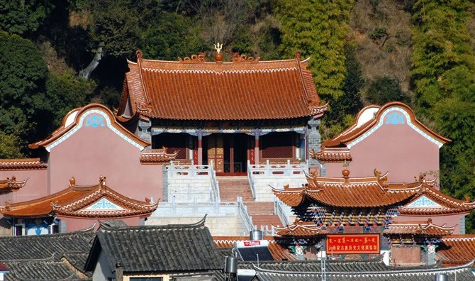 位于秀山后面,始建于明萬(wàn)歷二十四年(1596年),因?yàn)樗屡杂幸蝗湃司徒ù怂虏⑺荦埻跸窆┯谒轮。白龍寺屬一進(jìn)院前后各三間夾四耳、寺內(nèi)保存一塊明代碑刻,碑陰記錄了當(dāng)時(shí)海貝巴(貝幣)的捐贈(zèng)情況。上世紀(jì)80年代在白龍寺下開辟了茶花園、牡丹園、蘭花園,總占地8000多平方米。秀山古建筑群于1987年被省政府公布為“第三批文物保護(hù)單位”。