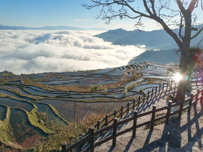 那諾哈尼云海梯田位于那諾鄉(xiāng)政府駐地的東面和南面坡度平緩的山梁上,距縣城66公里。梯田鱗次櫛比,循坡面布置連片。