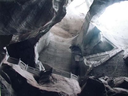 順石級而上,便可見一處寬敞的石廳。廳中有一巨石雕刻成的大碗。大碗直徑2.12米,可裝2噸多水,碗中有龍頭龜身的吉祥物。此碗已被列入世界吉尼斯記錄。從石廳左轉(zhuǎn),到達(dá)另一石廳。此廳存放著巨型石刻古錢幣。石青色,內(nèi)徑為0.8米,刻有“政和通寶”四字。從巖頂隙中滲出的清泉涓涓而下,剛巧穿過錢幣中央,因此古錢幣中央終年泉水滿盈。