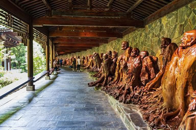 以根雕藝術(shù)展現(xiàn)佛教文化的圣地,是由千年樹(shù)神匯聚的藝術(shù)殿堂,建筑面積1.2萬(wàn)平方米,縱深有三座大殿,第一幢為雙層結(jié)構(gòu),第二第三幢均為單層結(jié)構(gòu)。兩邊另有羅漢文化長(zhǎng)廊依山而建,環(huán)繞其間,有未來(lái)佛殿、大雄寶殿、羅漢堂等,陳列有釋迦牟尼、未來(lái)佛、四大菩薩、四大天王、五百羅漢等佛教文化系列巨型根雕作品一千余件,其中最大的根雕釋迦牟尼主佛,形體龐大,重達(dá)40余噸,根材花巨資,于中緬邊境一路繞道跋涉而來(lái),經(jīng)醉根“點(diǎn)化”,巍然成佛!五百羅漢陣更是氣勢(shì)雄偉,長(zhǎng)達(dá)680余米,整體布局渾厚古雅,堪稱(chēng)中華一絕、世界之最。