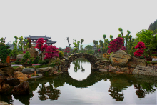 地處根宮佛國(guó)文化旅游區(qū)山麓,緊依根雕佛國(guó),有醉松亭、日月亭、回思廊、靜心亭、樂(lè)禽園等景觀建筑,陳列有以松柏類(lèi)為主的盆景藝術(shù)作品1500余盆,造型博采眾長(zhǎng),創(chuàng)意自然,有小橋流水田舍人家的水旱盆景,有濃縮華山天險(xiǎn)附石盆景,有的以石為盆回歸自然,有的三五成林意境高遠(yuǎn),大自然的千奇百怪,于方寸間一覽無(wú)余,具有空中花園美譽(yù)。