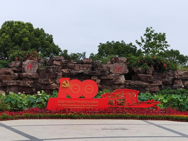 是為紀(jì)念中國共產(chǎn)黨第一次全國代表大會在南湖閉幕而建造的一座革命紀(jì)念館。作為中共“一大”會址重要場館和黨的誕生地,1959年根據(jù)有關(guān)部門的決定,經(jīng)中央審查同意,嘉興市籌建南湖革命紀(jì)念館,不僅仿制了南湖畫舫,還在湖心島建立了南湖革命紀(jì)念館,紅船停靠的湖心小島成為最初的館舍,于煙雨樓大廳中開辟中共“一大”史料陳列。1991年7月,為慶祝中國共產(chǎn)黨成立70周年,紀(jì)念館移建南湖北岸,由鄧小平同志題寫?zhàn)^名,建設(shè)資金主要由黨員自愿捐獻(xiàn)。建成的紀(jì)念館由鐮刀、錘子形組成的紀(jì)念性建筑物,占地面積3800平方米,建筑面積1980平方米。紀(jì)念館坐北朝南,廣場上有高大威嚴(yán)的宣誓臺和大型石雕照壁以及四個火炬型花壇。在鮮花擁簇下,紀(jì)念館顯得莊嚴(yán)雄偉。沿著臺階進(jìn)入陳列大廳,正面是一艘南湖紅船模型和“中國共產(chǎn)黨第一次全國代表大會史料陳列”,兩個展廳分別布置了《中國共產(chǎn)黨第一次代表大會史料陳列》、《黨和國家領(lǐng)導(dǎo)人對南湖的關(guān)懷》等陳列,其中包括江澤民、胡錦濤、朱镕基、楊尚昆、宋平、姚依林、彭真等中央領(lǐng)導(dǎo)同志前來參觀、考察的照片和江澤民、李鵬、陳云、李先念等同志為紀(jì)念館的題詞。南湖革命紀(jì)念館是中國百個愛國主義教育基地之一,每年有近百萬的游人前來參觀瞻仰。