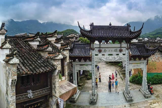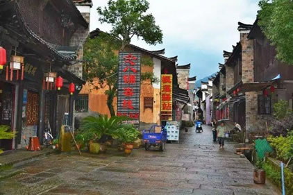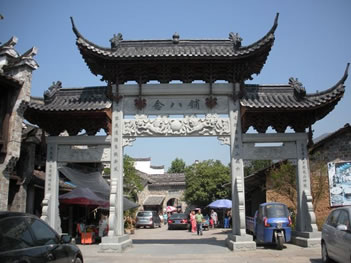 古鎮(zhèn)的大戶有曹、姜、楊、金四家。他們圍繞著宗族而居,至今還保留著36幢完整的古民居大院。站在老街上,最富有特色的是家家戶戶的門楣。門楣多為樓閣式,由梁、枋、檐、望板和垂簾虛柱構成四柱三樓式。各個部件都有精細的木雕裝飾,題材多為福祿壽、合和二仙等吉祥物。這木制的門楣和江南其他地區(qū)的磚雕門樓有著截然的反差,使人走在這老街之上,無不被這景色所吸引?催@徽式的馬頭墻、浙式的屋脊、贛式的檐櫞、閩式的土墻,其內涵的豐富已足以使建筑學家所驚嘆。