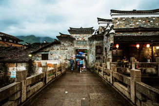 廿八都鎮(zhèn)的建筑依古道兩側而建,長達1公里。北為洵里街,以住宅為主;南為楓溪街,以經商為主。古鎮(zhèn)在清同治年為鼎盛期,光飯鋪酒店就50多家,南北雜貨批發(fā)商有40多家。然而更讓人注目的則是這里的橋、廟、閣等公共建筑。水安橋,一座廊橋橫架于楓溪之上,在晨霧的繚繞和夕陽的照耀下,展現出不同的側面,著實謀殺了我們不少膠卷。勞作了一天的人們和嬉戲倦了的孩童在廊橋休憩,又為這美景增色幾分。楓溪橋是典型的石拱橋構造,它與周邊的水星廟構成了一副恬淡而抒情的中國畫。其余的如花橋之類的只空留地名而已,原橋的構造不復存在了。