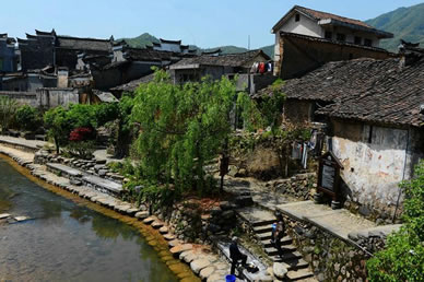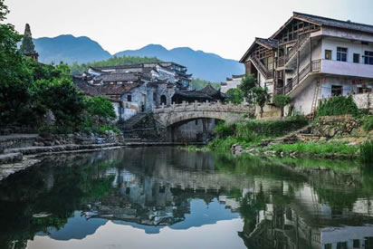 小橋如虹霓跨溪,上面長滿了綠藤,橋下水聲依依,站在不遠處的水埠上,半圓的橋拱與水中的倒影正好構成了一個圓,水波蕩漾,恍如一輪圓月,此景被叫做“楓溪望月”確是名不虛傳。