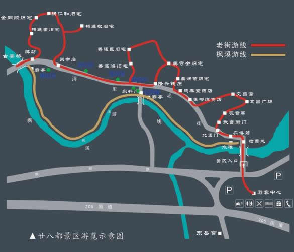 古鎮(zhèn)舊有東西南北四道城門,今唯有鎮(zhèn)南石質門額一方,書有“楓溪鎖鑰”。一條街道與小溪并行,自北至南曲折蜿蜒長達1公里。兩旁多為二層樓店鋪作坊,基本保持了19世紀集鎮(zhèn)的風貌。