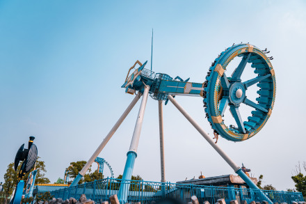 天旋地轉(zhuǎn),陀螺儀類(lèi)型游樂(lè)設(shè)施,高度16米,同時(shí)乘坐26人。當(dāng)轉(zhuǎn)臂與搖臂的轉(zhuǎn)速、旋轉(zhuǎn)方向在連續(xù)變化時(shí),座椅以前后、上下、左右不同方向旋轉(zhuǎn)不斷變換狀態(tài),搖擺、顛簸、翻滾……使乘客如置身于太空自由翱翔。