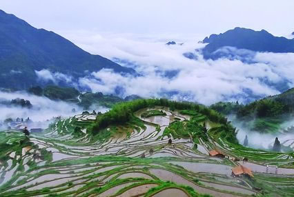 乍看似無(wú)序的曲線,在眩目的平臺(tái)狂歡,扭動(dòng)的身姿沒(méi)有雷同的,田塊的形狀沒(méi)有相似的,草色花色水色天色沒(méi)有凝固的,景隨步移沒(méi)有不變的,泥房炊煙、耕牛犁田、牧童短笛沒(méi)有靜止的……,畬漢兩族農(nóng)人,千年生命接力,用一種筑田岸、鏟田坎的古老技術(shù),向大自然求愛(ài),創(chuàng)造云和古老的童話世界。這就是云和梯田——中國(guó)最美梯田。