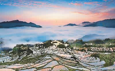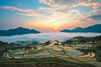 云和梯田如同一位四季美人:春穿花衫,水滿(mǎn)層疇:夏披綠紗,禾海滾浪;秋著紅裳,金穗漫山;冬裹銀裘,雪毯素裝。年復(fù)一年,山花不敗,鳴禽百?lài),流泉不竭。日?fù)一日,從山嵐染成金玫瑰,到白云變幻成蒼狗,一幕幕展現(xiàn)大自然造型和著色的奇詭。
