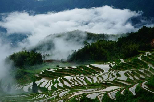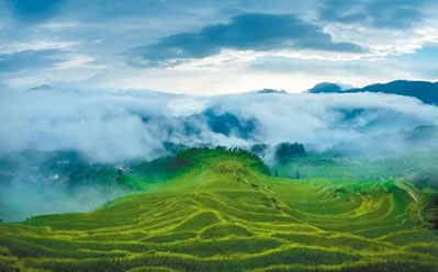 是梯田,是濕地,是澤國(guó),形成亦山亦水的奇觀,來(lái)源于森林腹地恒久的涵養(yǎng)補(bǔ)給,只見(jiàn)云水天來(lái),不見(jiàn)旱澇來(lái)襲。雨云象俏皮的村姑,出沒(méi)無(wú)定、行蹤無(wú)定,著裝無(wú)定,心情無(wú)定……忽而為項(xiàng)頸之哈達(dá),忽而為足下之地毯,忽而為纏腰之彩帶,親親云朵,感悟創(chuàng)意。這就是云和梯田——沉浮著的云水世界。