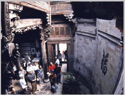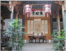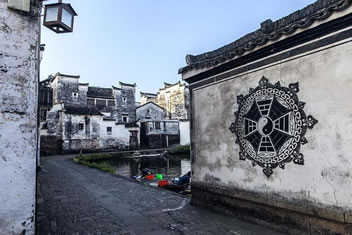 鐘池四周伸展出八條小巷,特點(diǎn)各個(gè)不同,形成了坎、艮、震、巽、離、坤、兌、乾八個(gè)部位。大公堂就在它的坎宮部位,從它的正門邊上東而去的一條十分幽深,一層層的臺階上坡,左側(cè)是綠蔭如蓋的園子,的一右側(cè)是一排排住宅的后墻,這條巷是通往村中十八廳堂之一的積慶堂的。鐘池東面條巷子很平直,100米長。八條小巷似通卻閉,似連卻斷,虛虛實(shí)實(shí),猶如一張蜘蛛網(wǎng),又宛如一座迷宮。