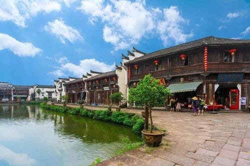 1958年大躍進(jìn),上塘被填,水閣樓大部分被拆除。 2000年諸葛村投巨資對上塘進(jìn)行了復(fù)原,重新挖出上塘,整修了口岸和路面,修復(fù)古店鋪、住宅。復(fù)原后的古商業(yè)街、店鋪一間緊挨一間。商業(yè)街上的排門式店鋪二層略略向上挑出于底層, 木板墻開有窗子,或?qū)嵃逋评交蚋裆仁,窗的下欄有裝飾性的花格欄桿,上下層的牛腿和騎門梁都刻有與商業(yè)性質(zhì)相合的蝙蝠銜錢,古老錢串、元寶、聚寶盆等,石庫門式的店鋪兩進(jìn)三進(jìn)較多,臨街一進(jìn)大多三間二搭廂,后進(jìn)為作坊或住宅。這種店鋪,在堂屋內(nèi)設(shè)柜臺,主要開設(shè)當(dāng)鋪和藥店為主,現(xiàn)今古街上有葆仁堂、壽春堂藥店。有浦江水晶、蘇州刺繡、永康錫器、龍泉寶劍、古董店、字畫店、百貨店、保健品店。萬源莊、永裕號、永泰昌、義生昌、筆耘軒等老字號招牌店鋪都已恢復(fù)。沿街連片的水閣樓搭在靠岸的水面上,上塘水閣樓基本建于太平天國之后,全用木結(jié)構(gòu)、木樁、木柱、木梁、木地板、木墻壁、木排門,水閣樓統(tǒng)一連排建造。上下兩層,臨水有挑臺。以經(jīng)營茶和小吃店為多,有饅頭店、餛飩店、面條粉干店、煙酒店、理發(fā)店。形成了一個(gè)豐富多彩、琳瑯滿目的旅游服務(wù)中心。