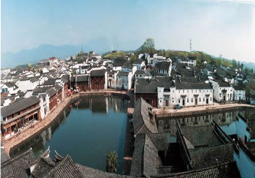 諸葛八卦村原來叫高隆村,位于浙江省金華市蘭溪市西部。諸葛八卦村一帶地形如鍋底,中間低平,四周漸高。四方來水,匯聚鍋底,形成一口池塘,這就是鐘池。鐘池是諸葛八卦村的核心所在,也是布列“八陣圖”的基點(diǎn)。鐘池并不大,但這口水塘半邊有水,半邊為陸,形如九宮八卦圖中的太極,奇妙無比。