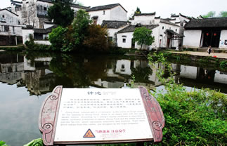 鐘池位于諸葛村的中心,在大公堂正前面,面積0.24公頃,它的邊上是一塊與它逆對稱面積的陸地,村民用以曬場之用。易經(jīng)上說“東南為陽、西北為陰”再加上“天圓地方”之說,空地和鐘池正呈陰陽太極圖形。陸地靠北和鐘池靠南各有一顆水井,正是太極中的魚眼。鐘池的南岸是一個(gè)陡坡,順著陡坡而建的幾幢大房子從北岸望去一幢比一幢高,加上前面貼水一溜小平房,跌宕起伏,輪廓線大起大落,景象峭拔而優(yōu)美。